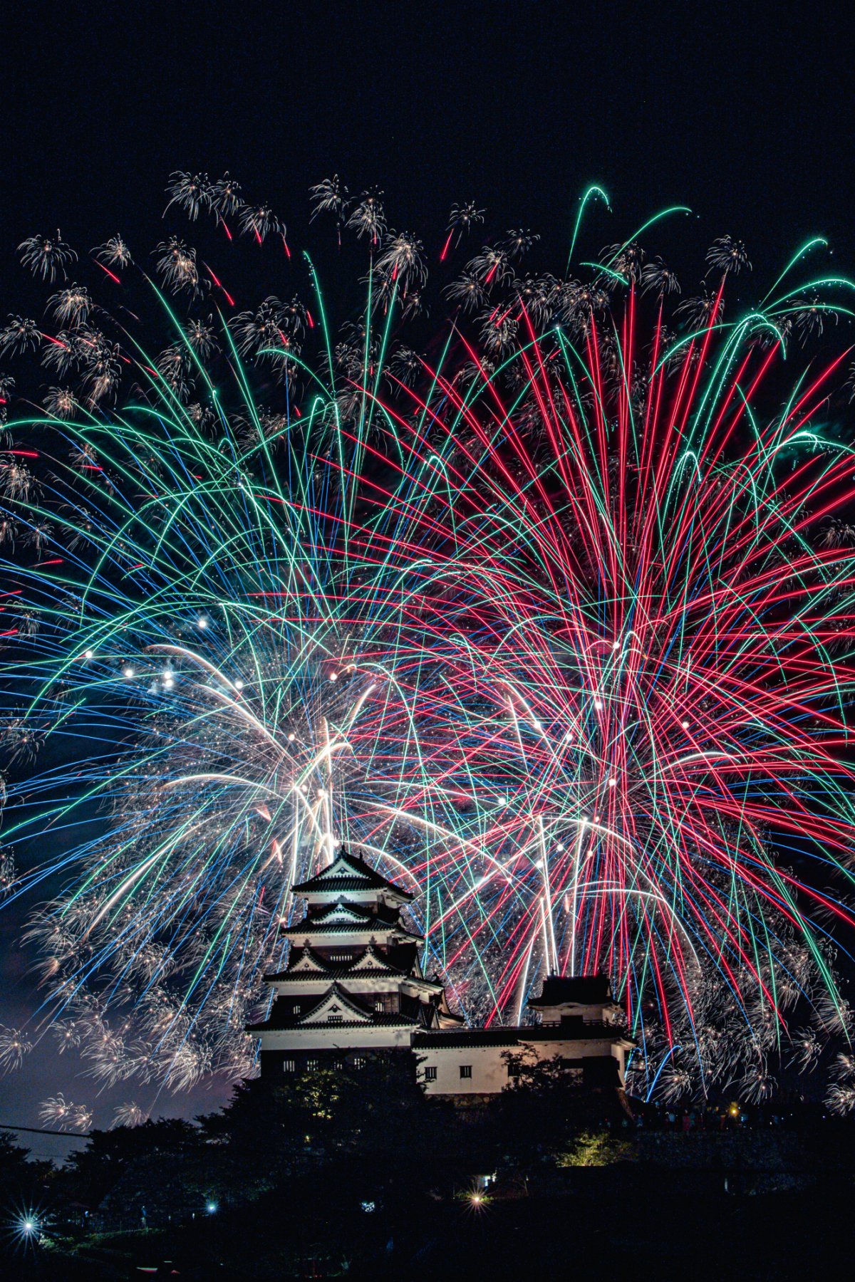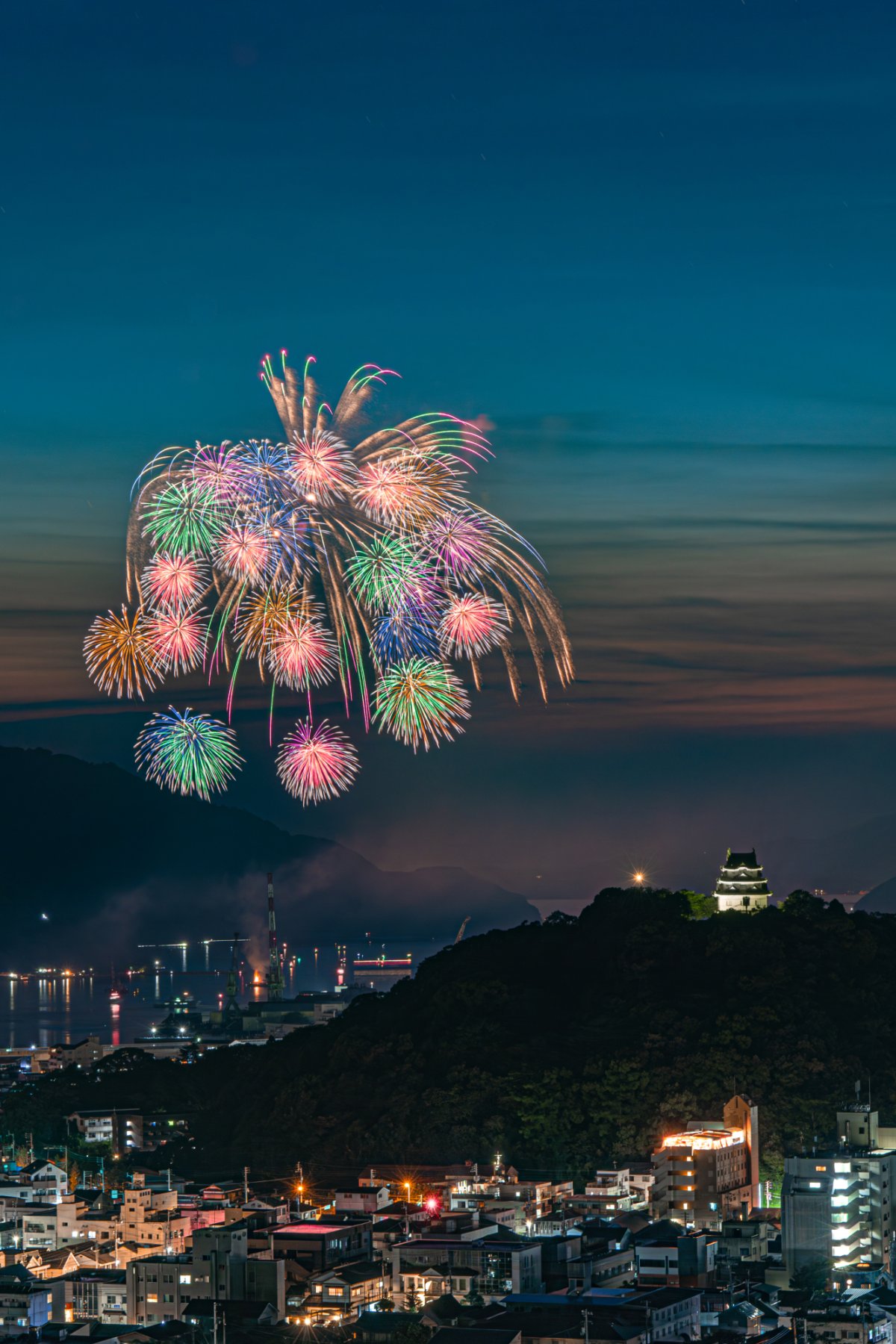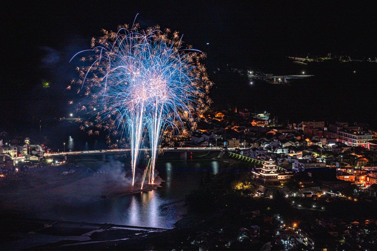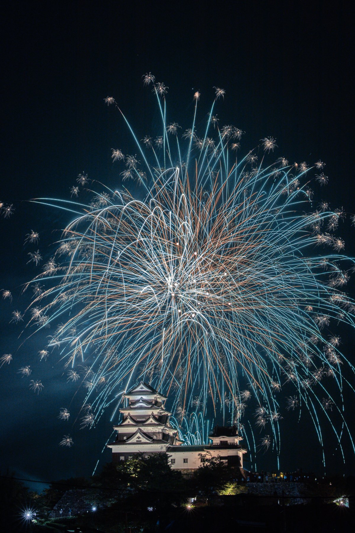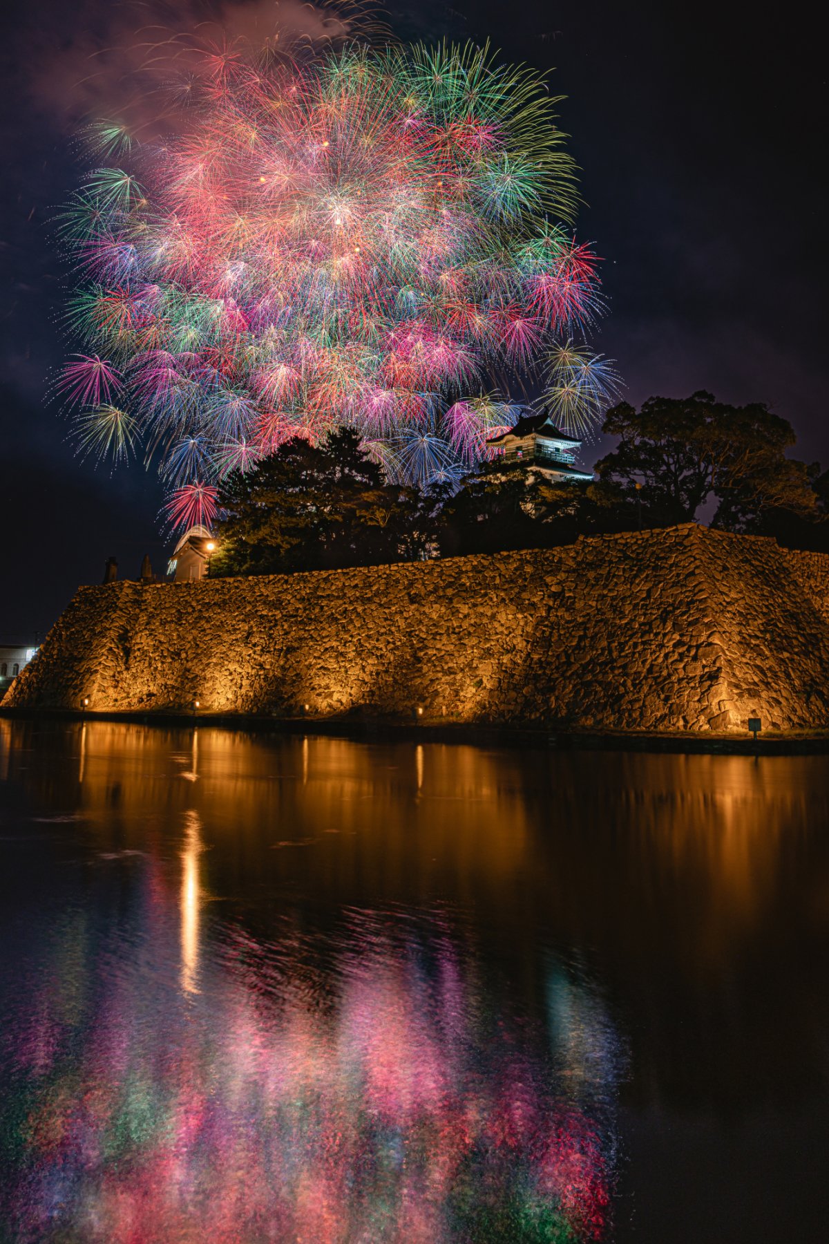 この花火大会の最大の魅力は大洲城と花火を一緒に見られる所です。歴史ある大洲城の真後ろで打ち上がる花火はとても幻想的な絶景を作り出します。お城と花火を一緒に撮れる場所は全国でも沢山ありますが、その中でもトップクラスのロケーションで、絶景好きにはたまらない花火大会ですね。過去に撮影していた時に「ここの花火は雑に撮ってもかっこよくなってしまうよね」という会話を聞きましたが、本当にその通りでした。昼間は風情ある街並みを散策し、夜は美しい花火を楽しむ、そんな一日を過ごされてみてください。