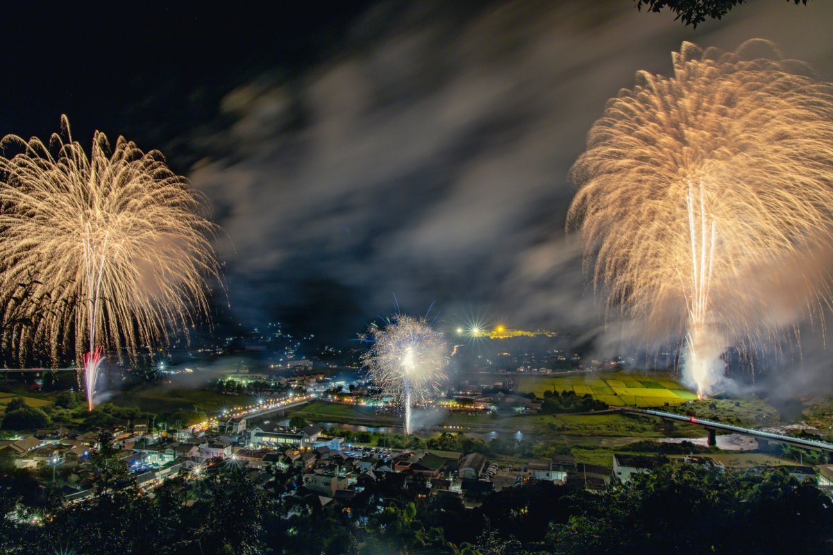 山々に囲まれた自然豊かな鬼北町で開催される「森の国の夏祭り」。大門橋を挟んだ2箇所からの打ち上げですが、70周年の記念大会ではなんと3ヶ所同時打ち上げという前代未聞のスケールで来場者を沸かせました。山々に反響する花火の音と大自然の中で見る花火はまた一味違った感動を与えてくれます。