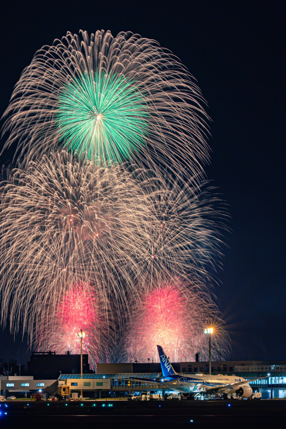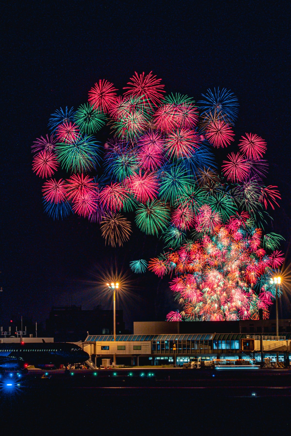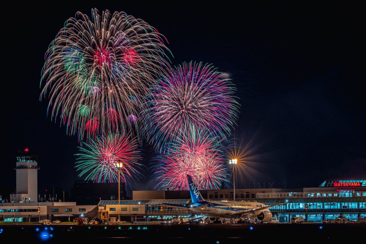 おんまく花火と並ぶ県内最大級の花火です。松山港の夜空に打ち上がる大輪の花火を松山城や松山空港と一緒に撮影できます。特に飛行機が着陸するタイミングと花火が重なると、ここでしか見られない特別な光景になります。カメラで撮影する方にはおすすめスポットですが、見る分には花火が小さいため現地付近での観覧をおすすめします!