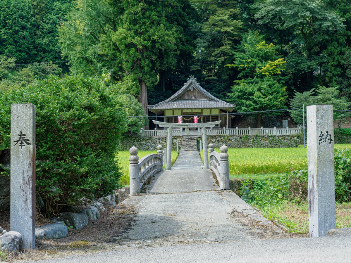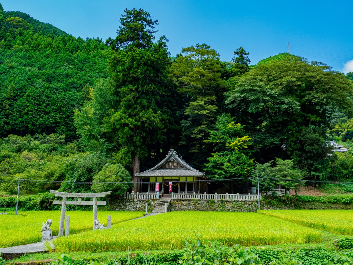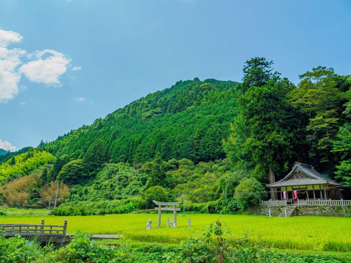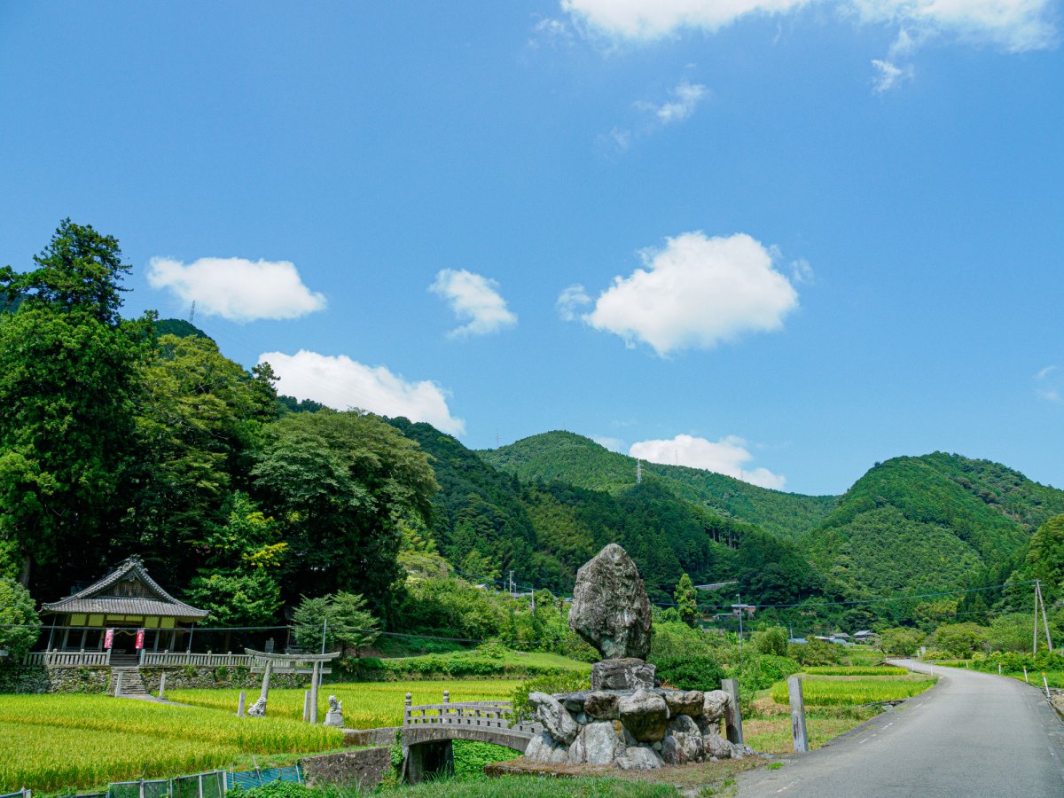 この神社へは、県道223号線(中山砥部線)を通って、栗田川の上流方向へ進んでいくとたどり着きます。道中、山あいののどかな風景が続き、やがて目の前に突然現れるのが、烏帽子杜三島神社です。そのたたずまいは非常に印象的で、田園風景の中に突如としてそびえ立つ巨木が、訪れる人の目を引きます。
