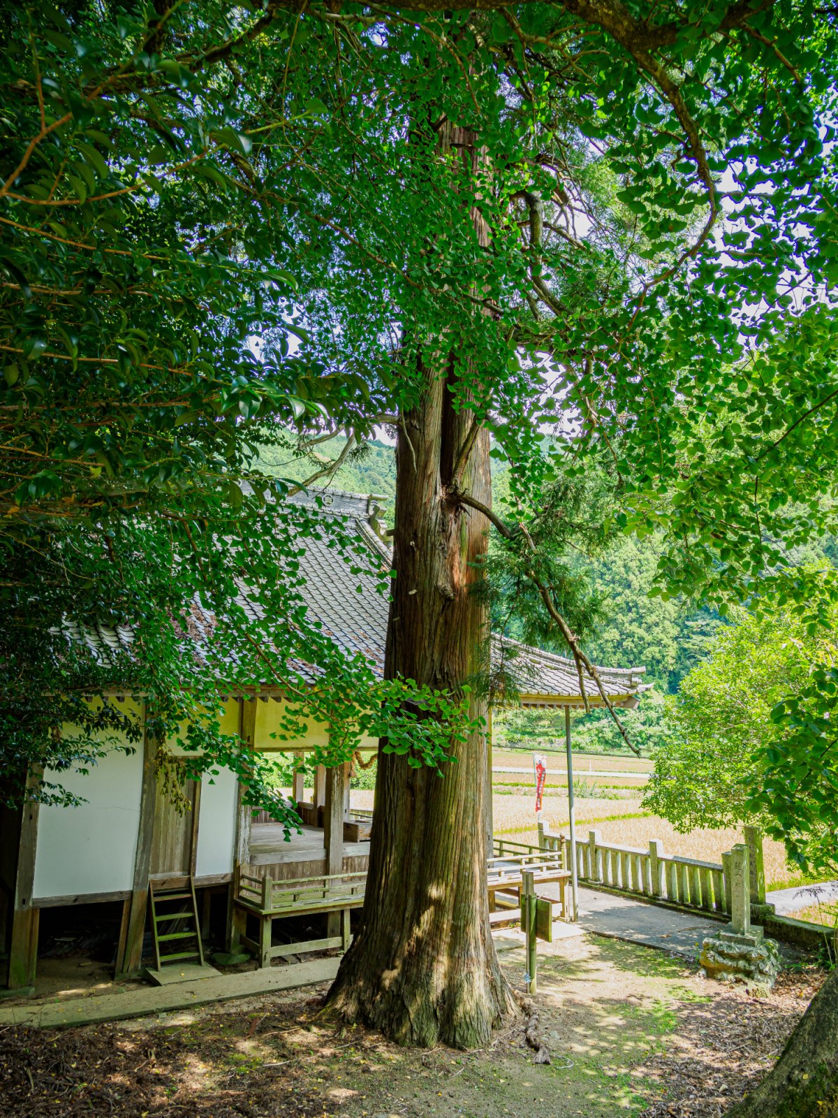 この神社の大きな特徴のひとつが、境内にある大スギのご神木です。その迫力は言葉では言い尽くせないほどで、まるで周囲の里山よりも高く見えるほどの存在感を放っています。遠近感の影響もありますが、それを差し引いてもなお、自然の力強さと神聖さを感じさせる巨木です。このご神木は、地域の人々にとっても大切にされており、神社そのものと同様に崇敬の対象となっています。