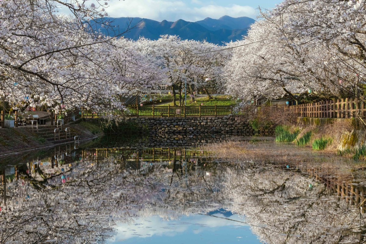 愛媛県内子町にある尾首の池は農業用のため池で、お花見スポットとして知られています。水面に写る桜は絶景!