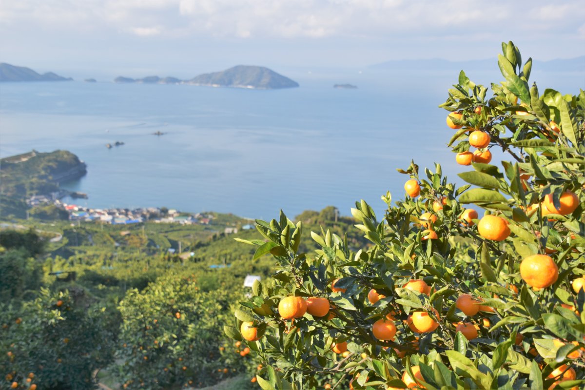 段々畑には、広がる緑の樹々とみかんの橙色が織りなす、水玉模様のような素敵な景色が広がります。