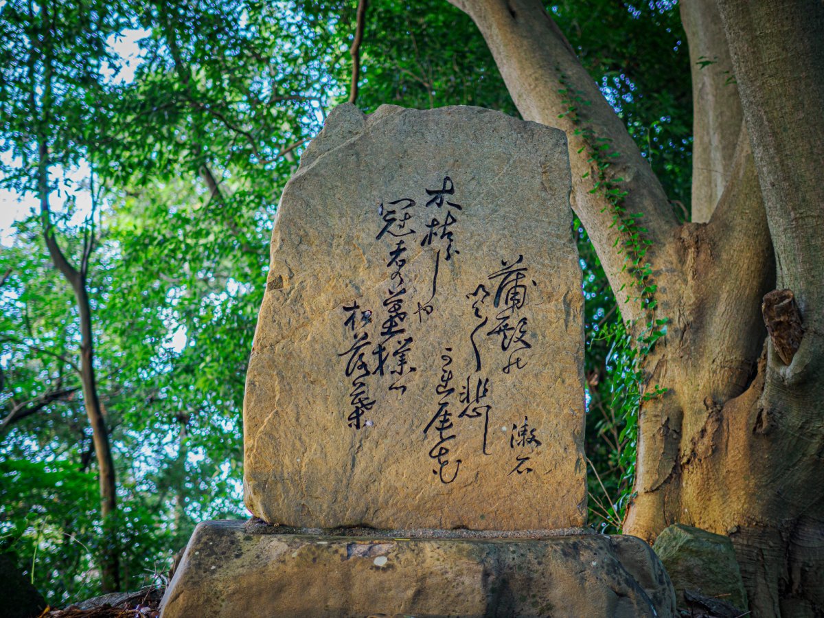 社殿前には、夏目漱石の句碑が静かに佇んでいます。全国に点在する漱石の句碑の中でも最古のもので、しかも2句が1基に刻まれた非常に珍しい句碑です。