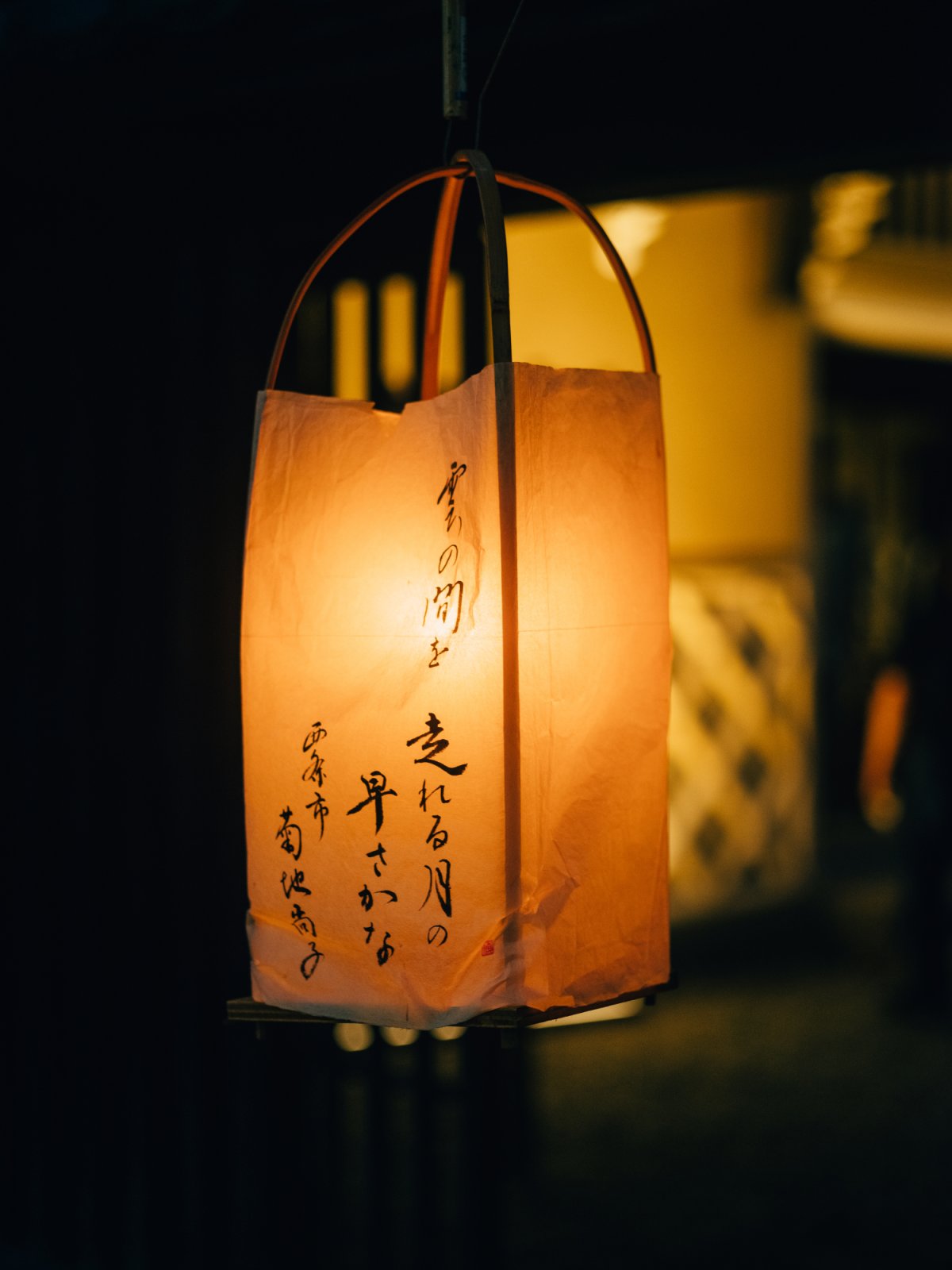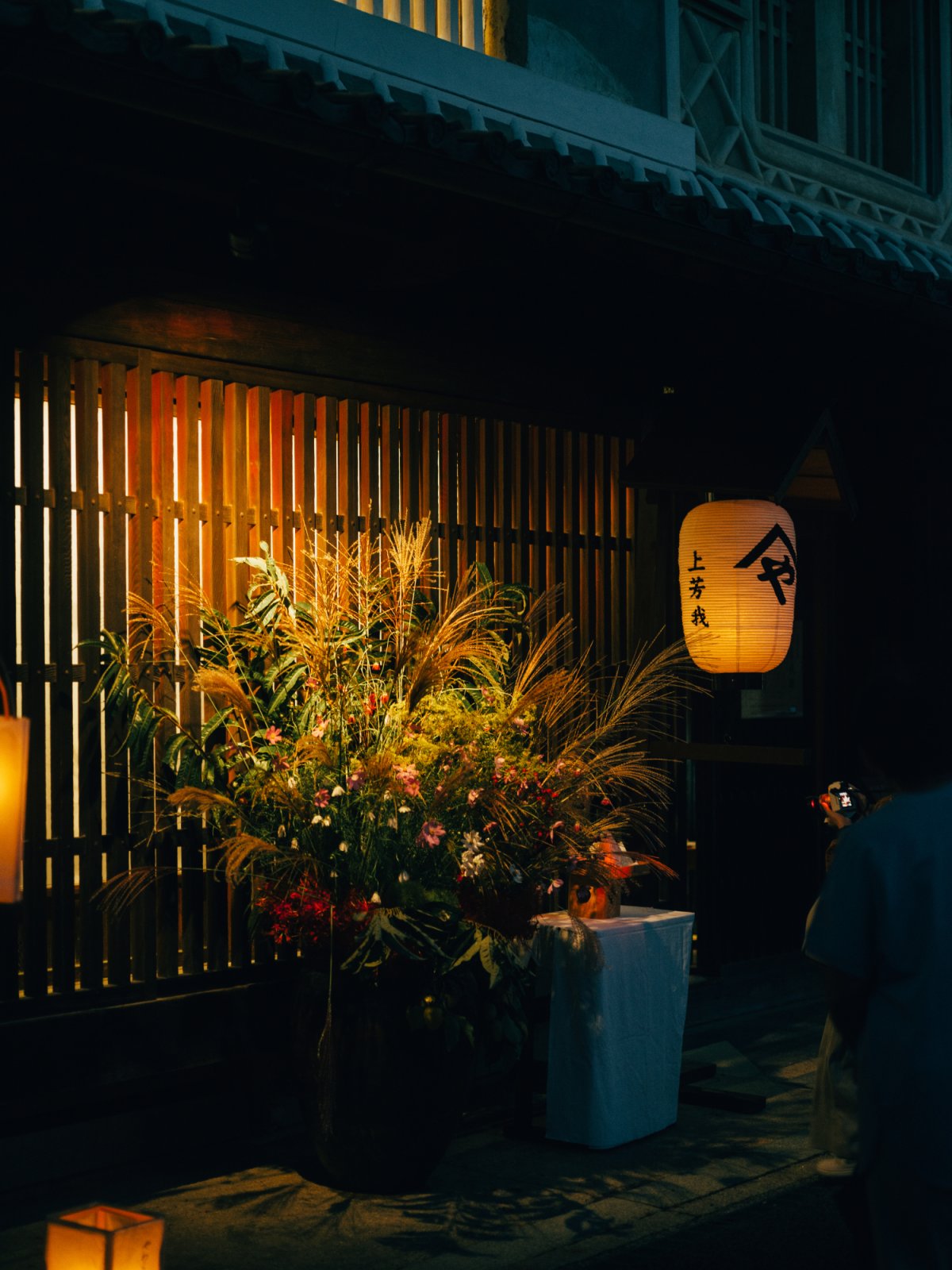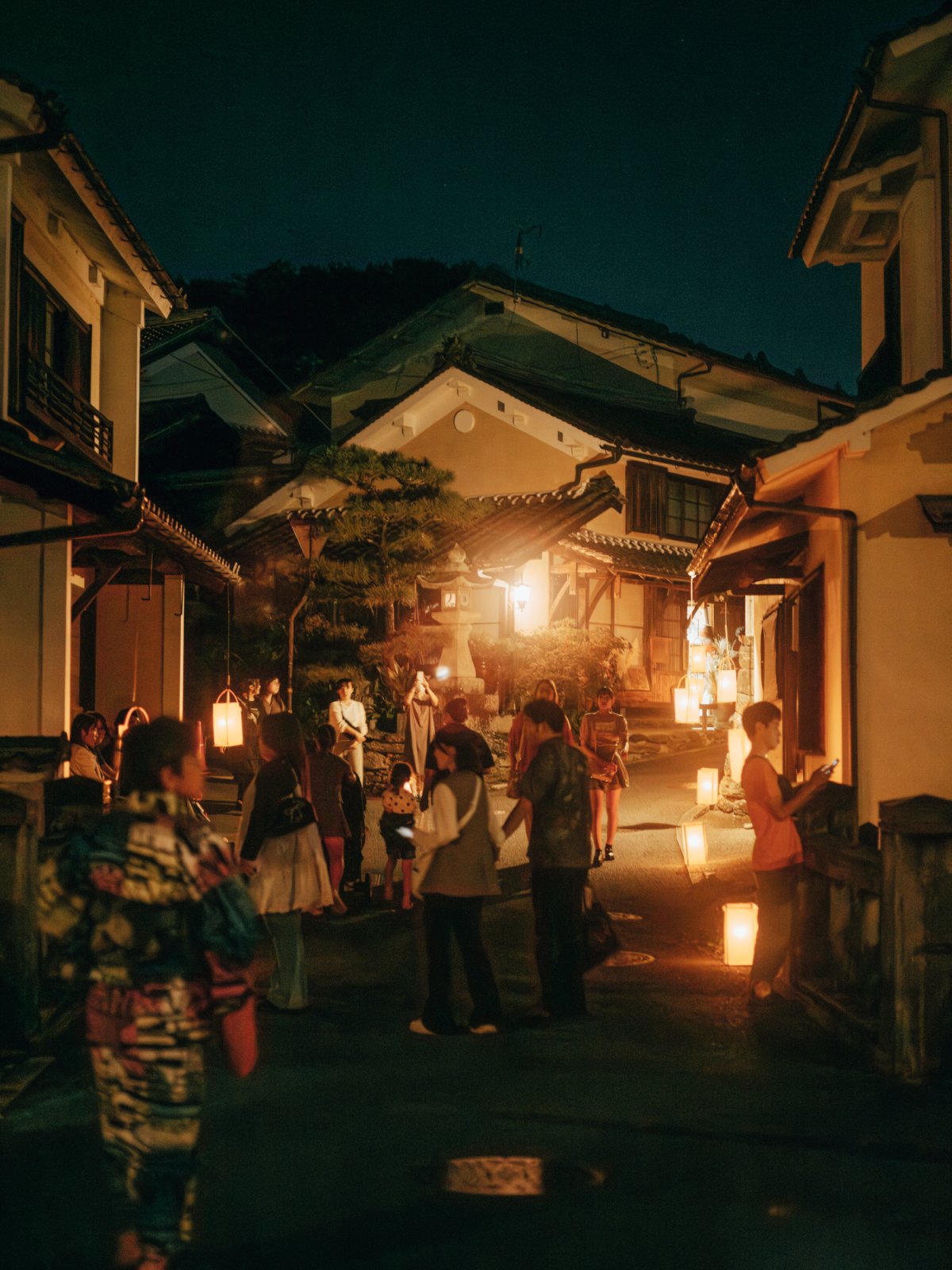 提灯と伝統的な町屋とが相まって、街全体を美しいコントラストで包んでいます。