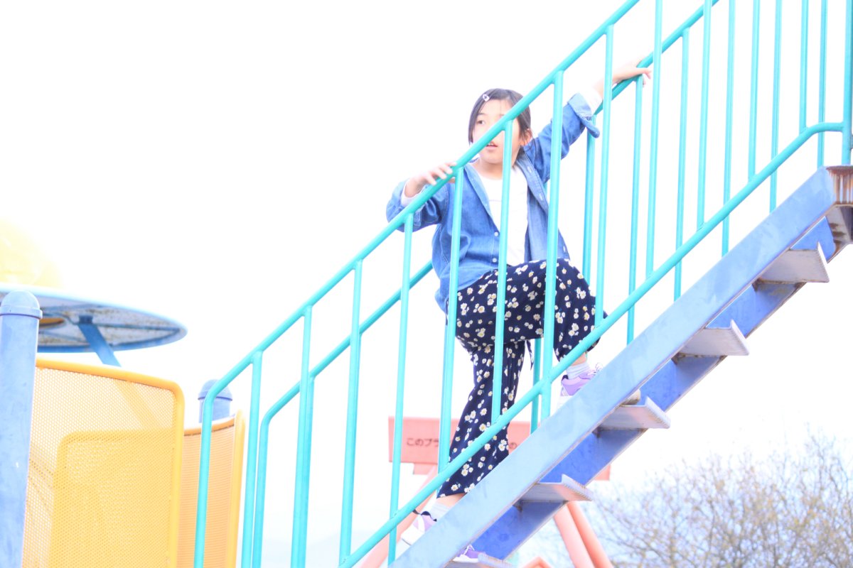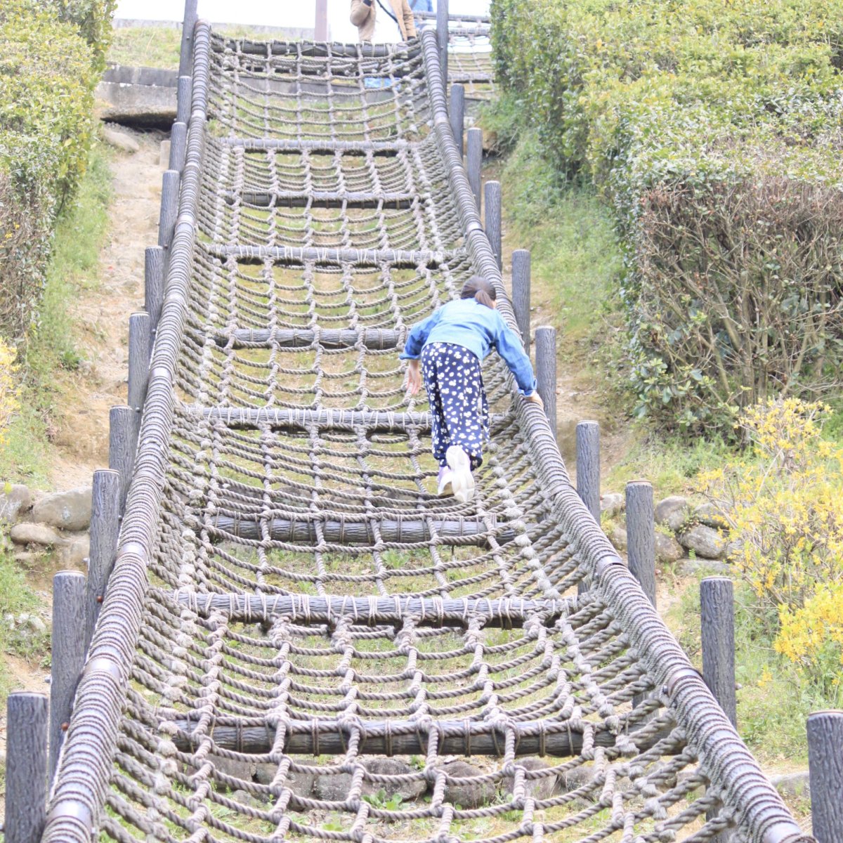公園まではアスファルトをくねくねと登っていくコース、急勾配のロープの橋を登るコースとあり、お子さんが挑戦する姿