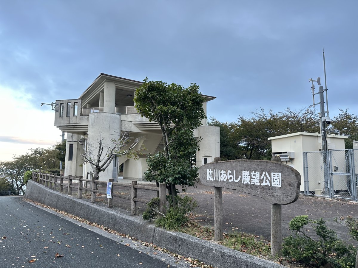 幻想の霧を一望できる絶景スポット「肱川あらし展望公園」。国道378号線から車で約10分、標高約159mの高台に位置し、長浜の町並みや肱川河口、そして瀬戸内海までを一望できます。
