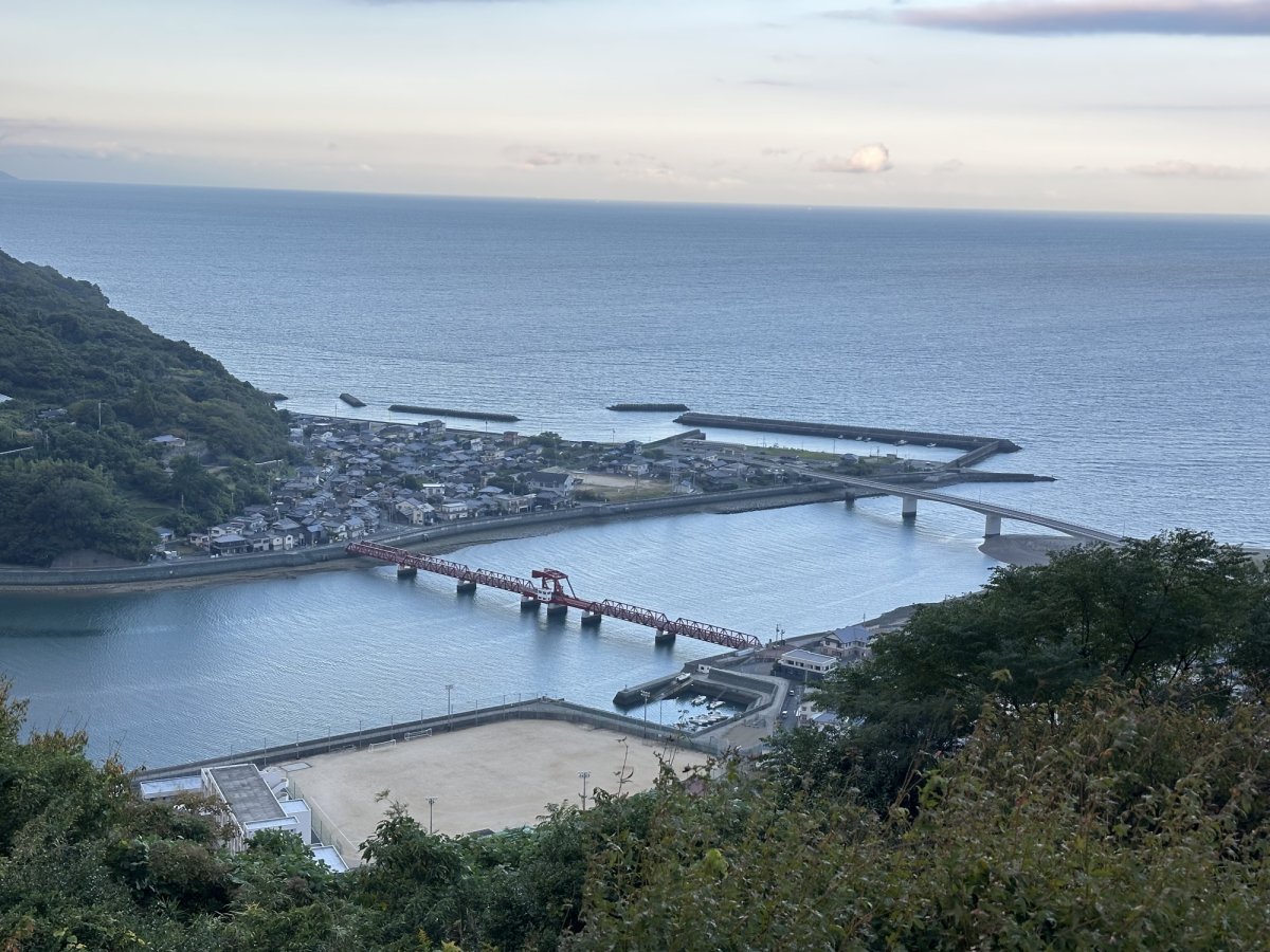 その「肱川あらし」を望む絶景スポットの「肱川あらし展望公園」、そして日本最古の現役可動橋「長浜大橋」。赤い鉄骨が朝日に染まる姿は、まるで歴史そのものが輝いているかのようです。