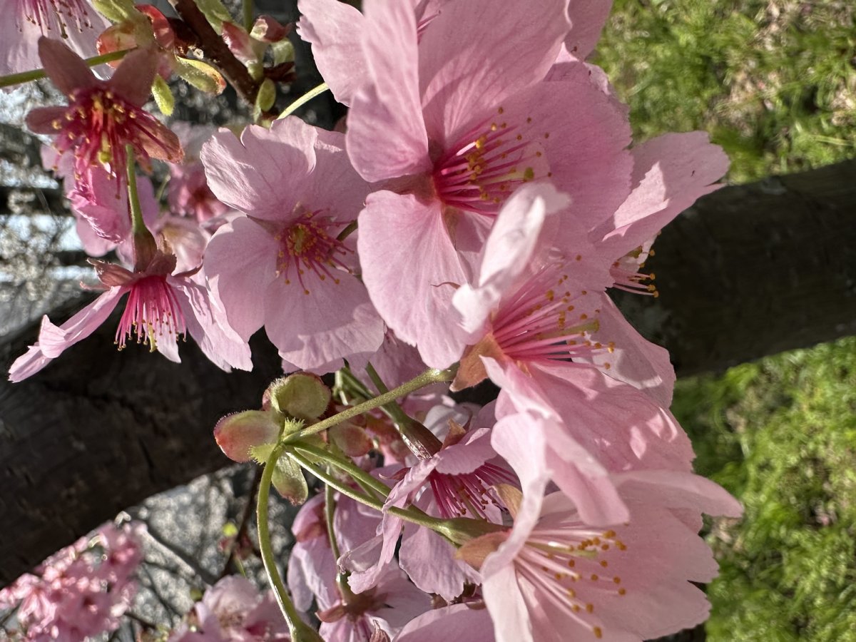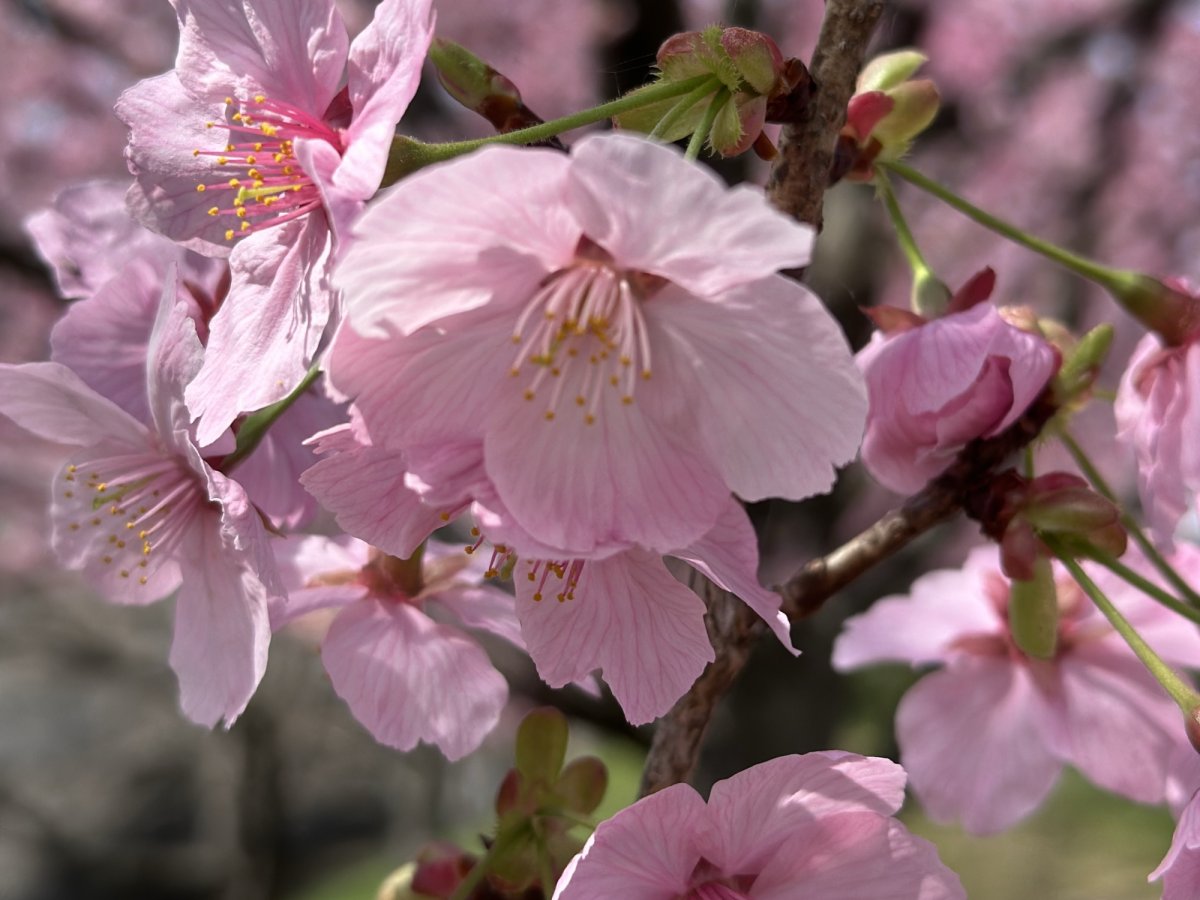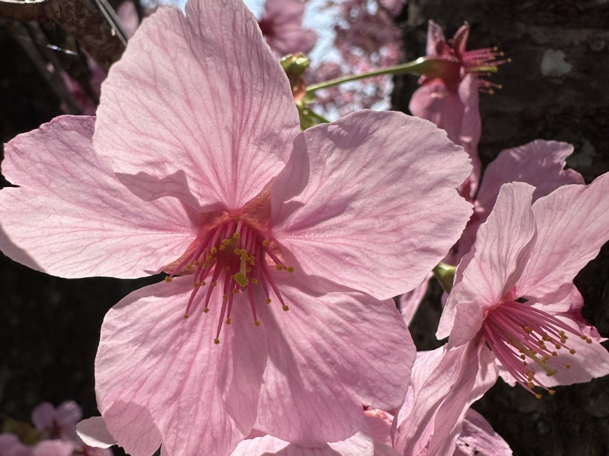 砥部町に隣接する東温市出身の高岡正明さんが生み出した「陽光桜」は、地域ゆかりの品種です。 「アマギヨシノ」と「カンヒザクラ」を交雑して作られ、濃いピンク色と大きめの花が特徴。花径4〜5センチの花がまとまって咲くため、遠くからでも存在感があります。