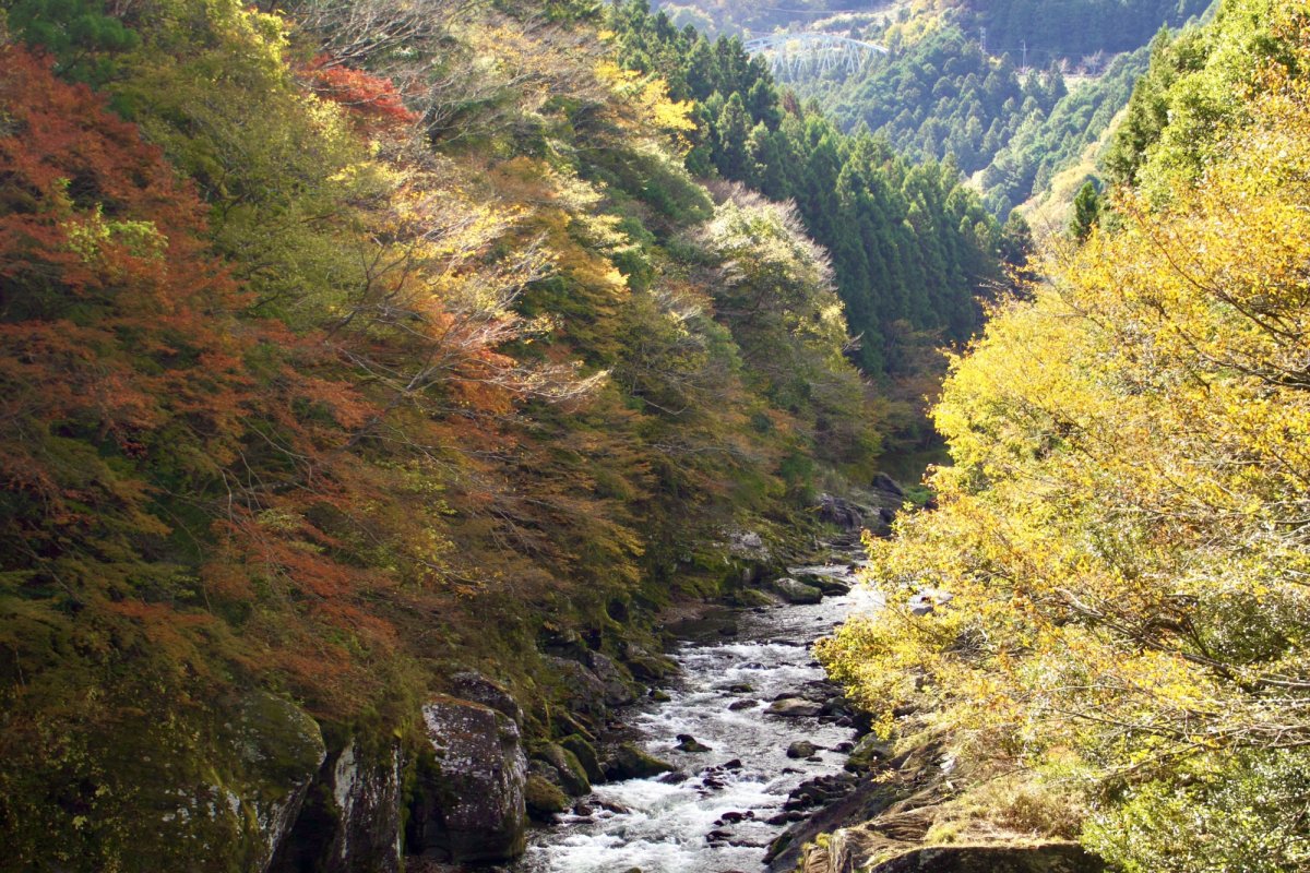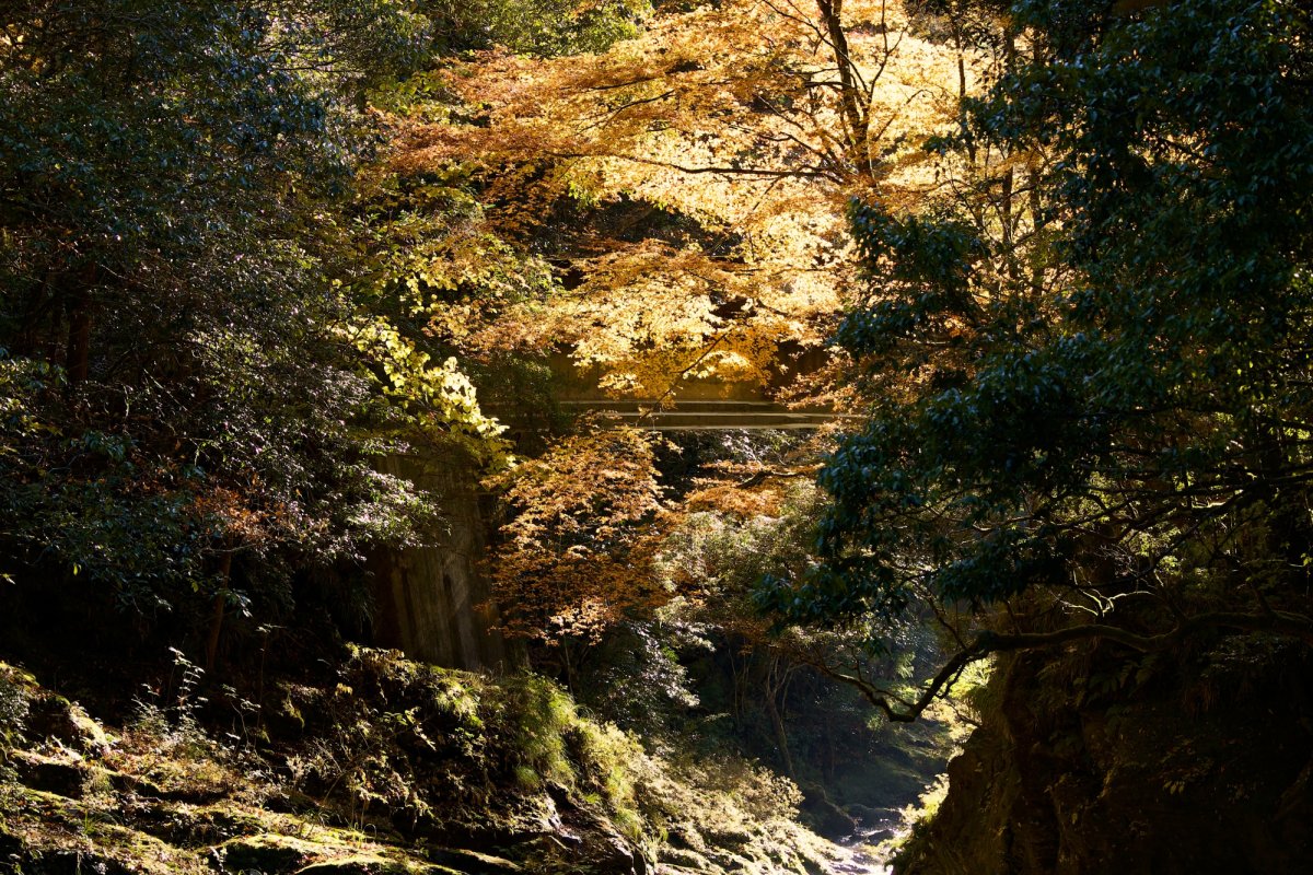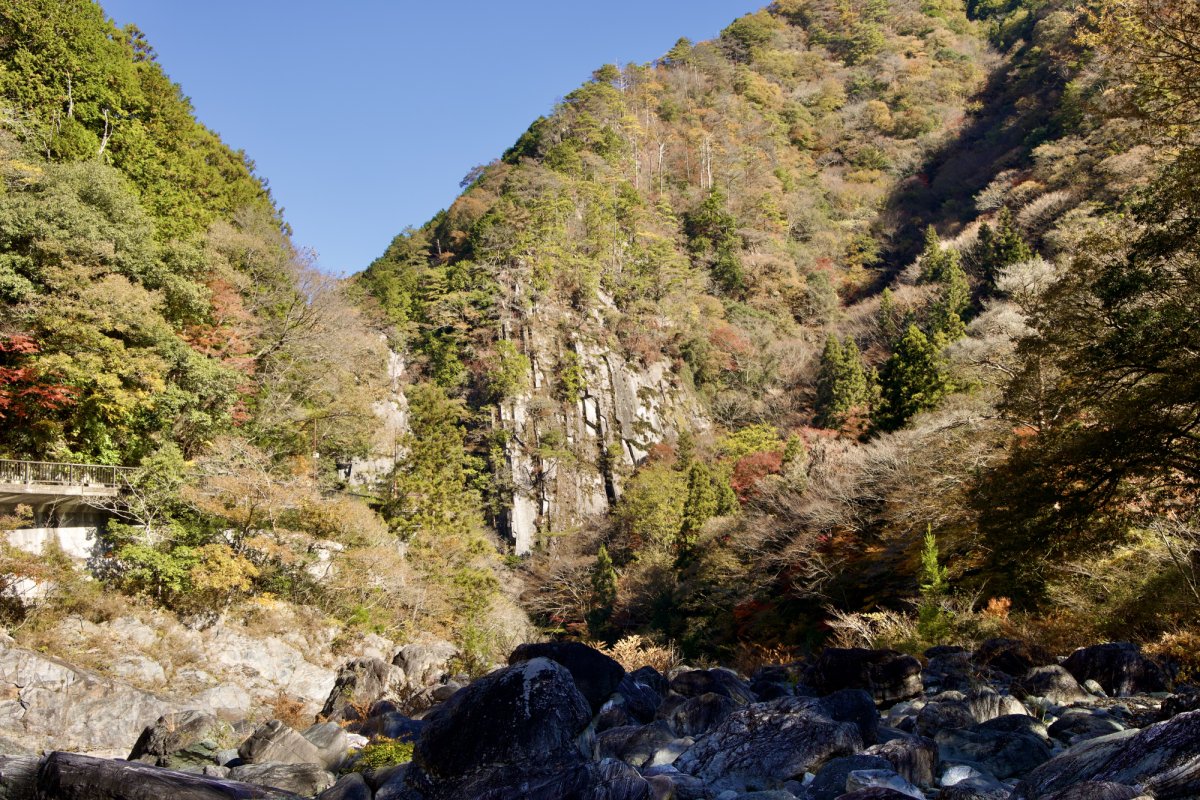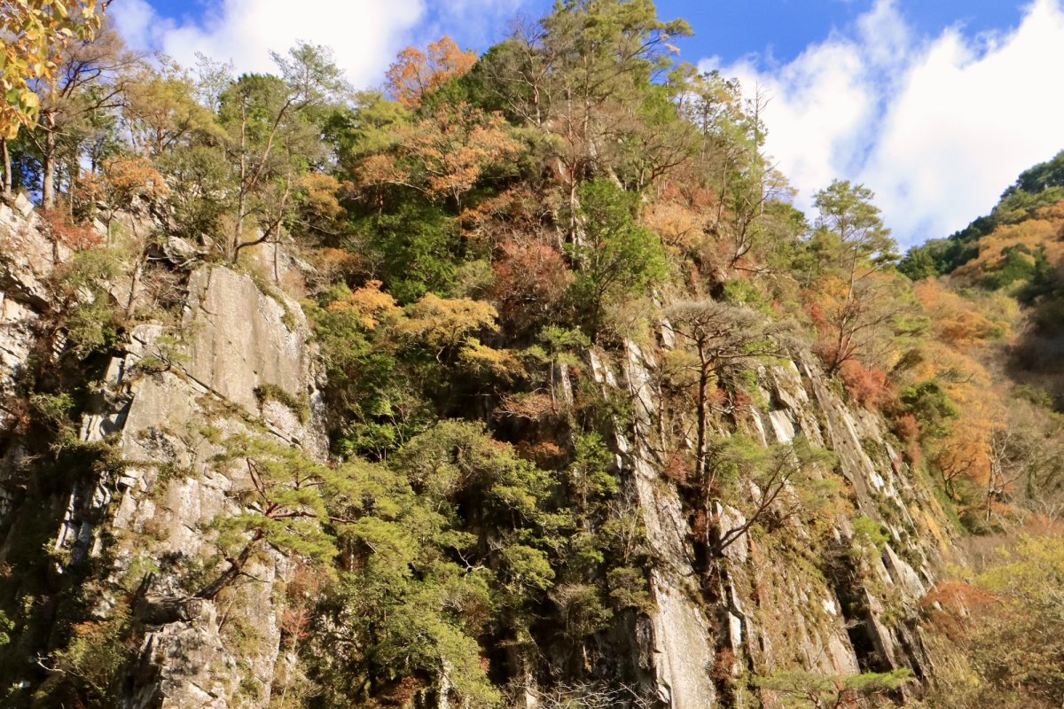 渓谷沿いに広がる紅葉の中でも、赤やオレンジ色が印象的な富郷渓谷。午前中はまだ陽が差し込まず、少し薄暗い静かな表情を見せますが、昼ごろからは一変し、光を受けた紅葉が渓谷を鮮やかに染め上げます。そびえ立つ戻ヶ嶽(もどりがだけ)の絶壁は迫力満点で、車で走るだけでも気分が高まる景色。スケール感あふれる秋の渓谷です。