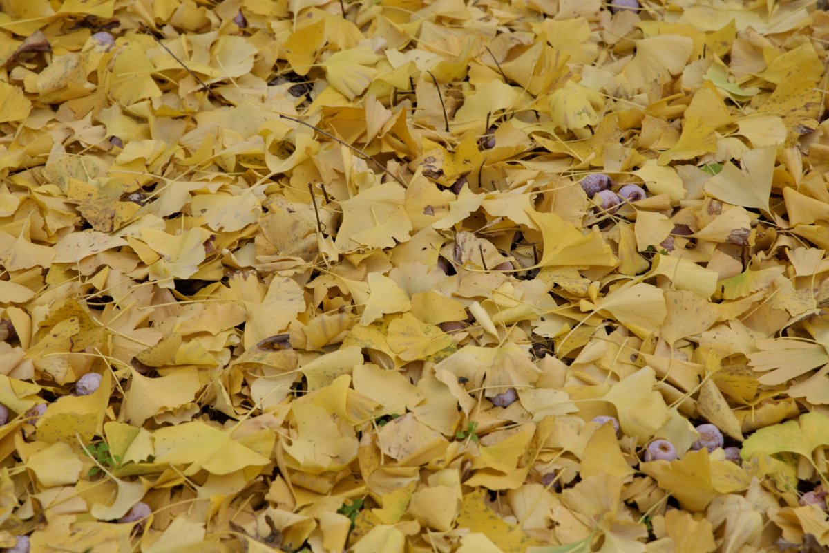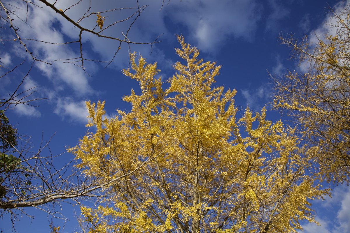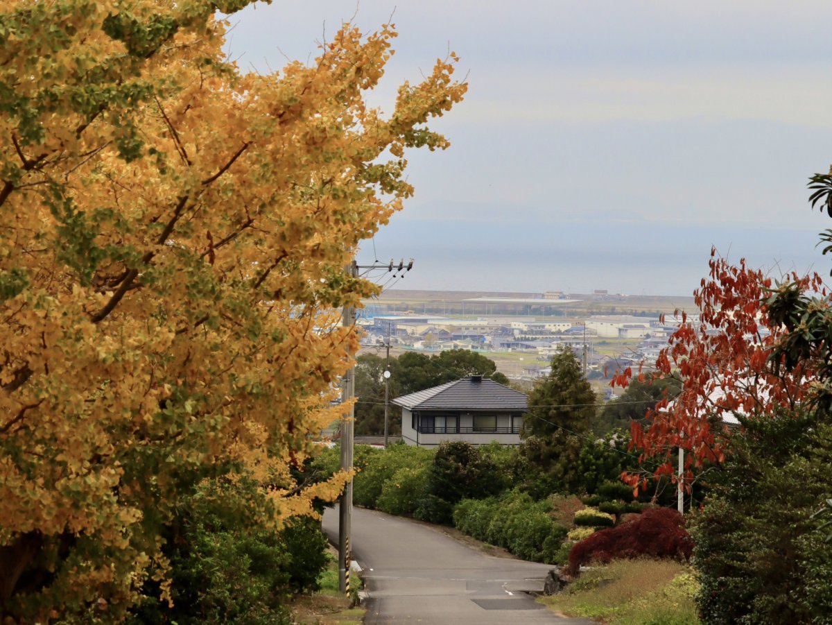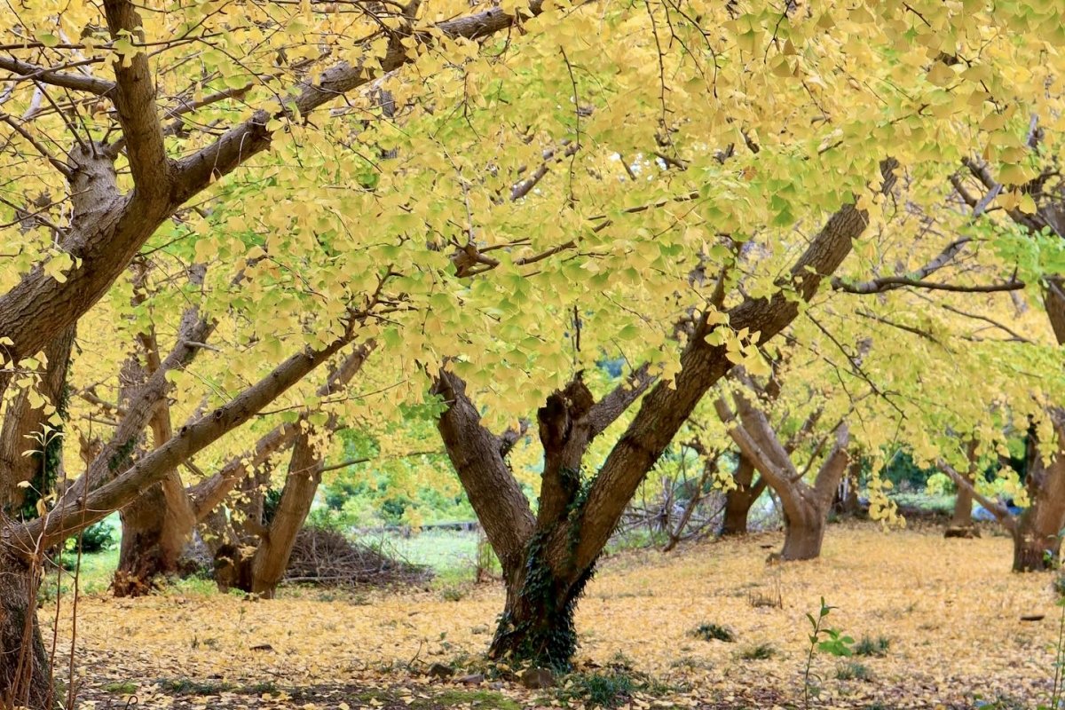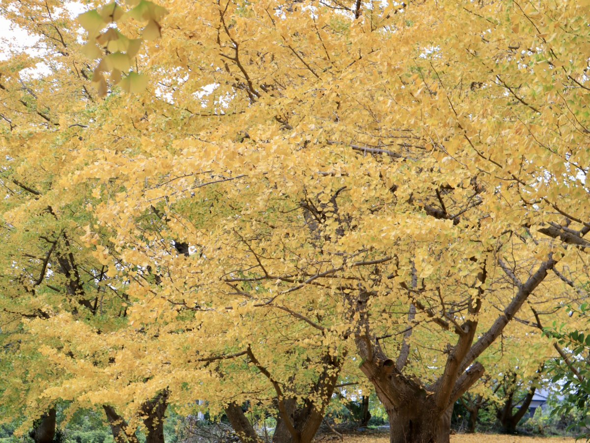 毎年訪れている山上銀杏園。私が足を運ぶのは、いつも散り始めのころです。木々からはらはらと舞い落ちるイチョウの葉が足元に重なり、一面に黄色のじゅうたんが広がります。山手に位置する園内からは、遠くに瀬戸内海を望むこともでき、澄んだ空気と秋色が重なり合う景色は格別。静かに季節の移ろいを感じられる場所です。