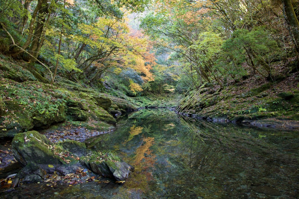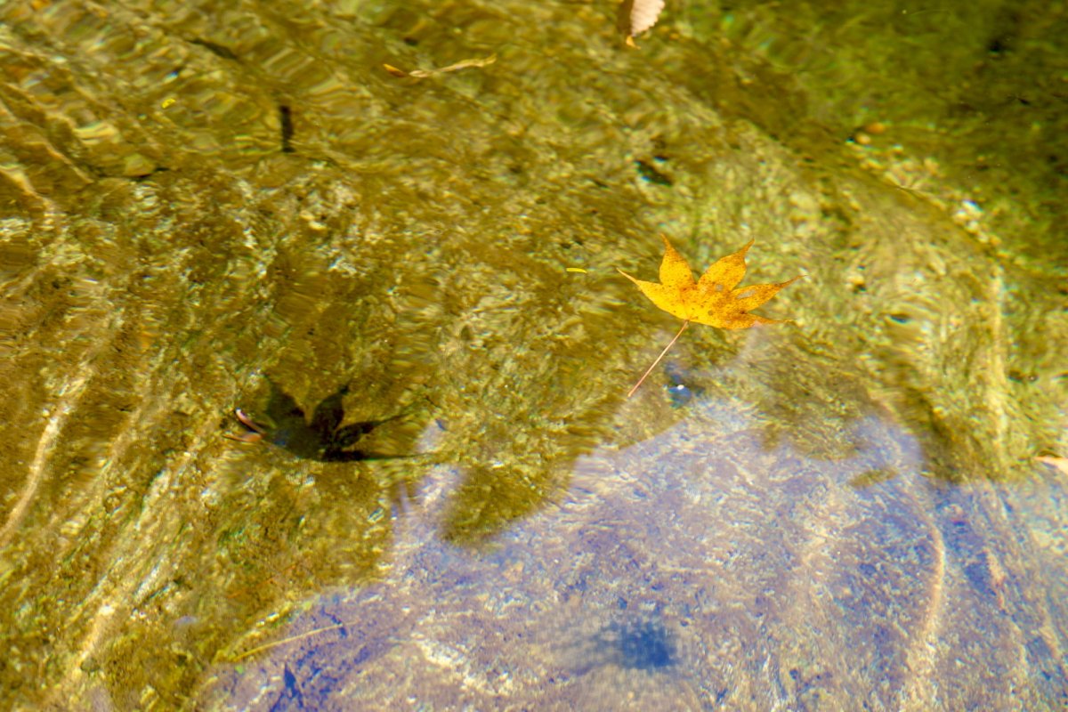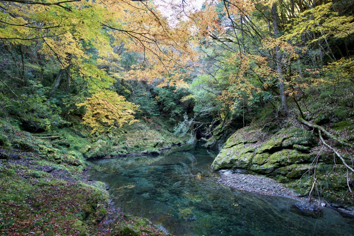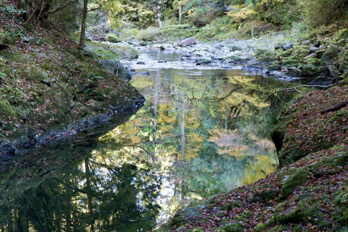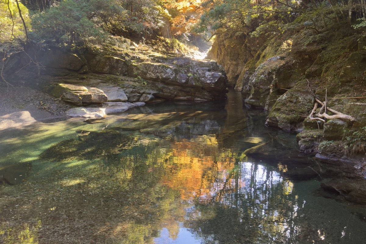 それぞれ場所は違いますが、距離が近いため、あわせて巡りたいのが「こうやけの淵・めん淵・おん淵」。大きめの落葉樹が点在し、赤や黄色に染まった葉が澄んだ水面に映り込み、落ち葉がゆっくりと流れていく様子は、この場所ならではの風景。山深い場所にあり、道幅が狭く路面状況も良いとは言えないため、訪れる際は十分な注意が必要です。静けさと自然の濃さを感じられる、まさに秘境の紅葉スポットです。