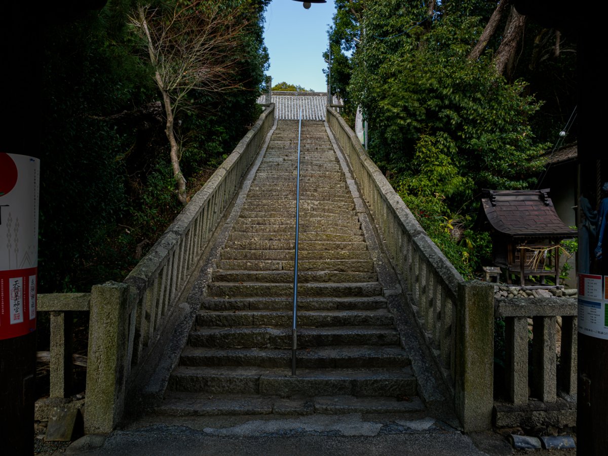 参拝者をまず迎えるのは、天へと続くような57段の石段です。この段数には「ごなん(57=御難)を去る」という願いが込められており、一段ずつ踏みしめて登ることで、身に降りかかる災厄を払い落とすことができると言い伝えられています。周囲を包むのは、植物学的にも極めて貴重な「照葉の森」。松山平野で唯一残された自然林の深い緑と、静寂の中に響く鳥の声が、日常のストレスを浄化してくれます。頂上に立ち、振り返った時に広がる伊予の風景は、まさに心洗われる絶景です。