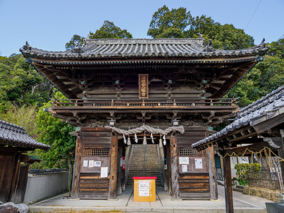 石段の手前、威風堂々とそびえ立つのが嘉永2年(1849年)に再建された楼門です。この門は、愛媛県民が「お椿さん」の愛称で親しまれる伊予豆比古命神社(いよずひこのみことじんじゃ、椿神社とも慕われています)の楼門を建てる際、その手本(モデル)にされたという驚きのエピソードを持っています。細部に施された精緻な彫刻や力強い木組みは、当時の職人たちの情熱と高度な技術を今に伝えており、建築ファンならずとも思わず足を止めて見惚れてしまう美しさです。