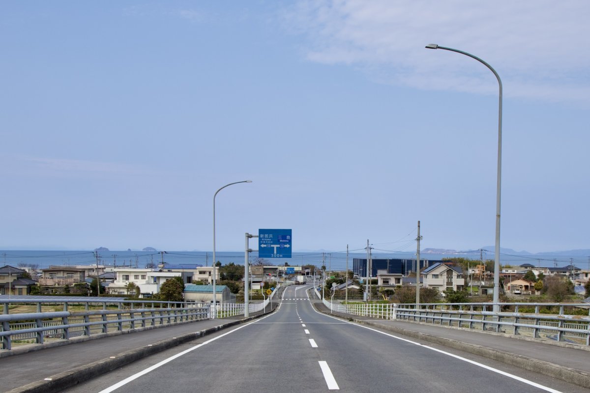 四国中央市、土居インターチェンジからまっすぐ海へと続く一本道。