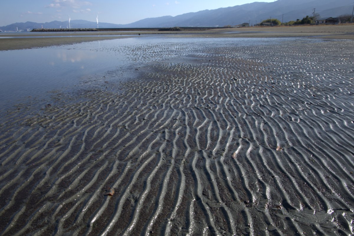 砂浜に残された水のラインが、まるで大地に描かれた模様のように広がります。