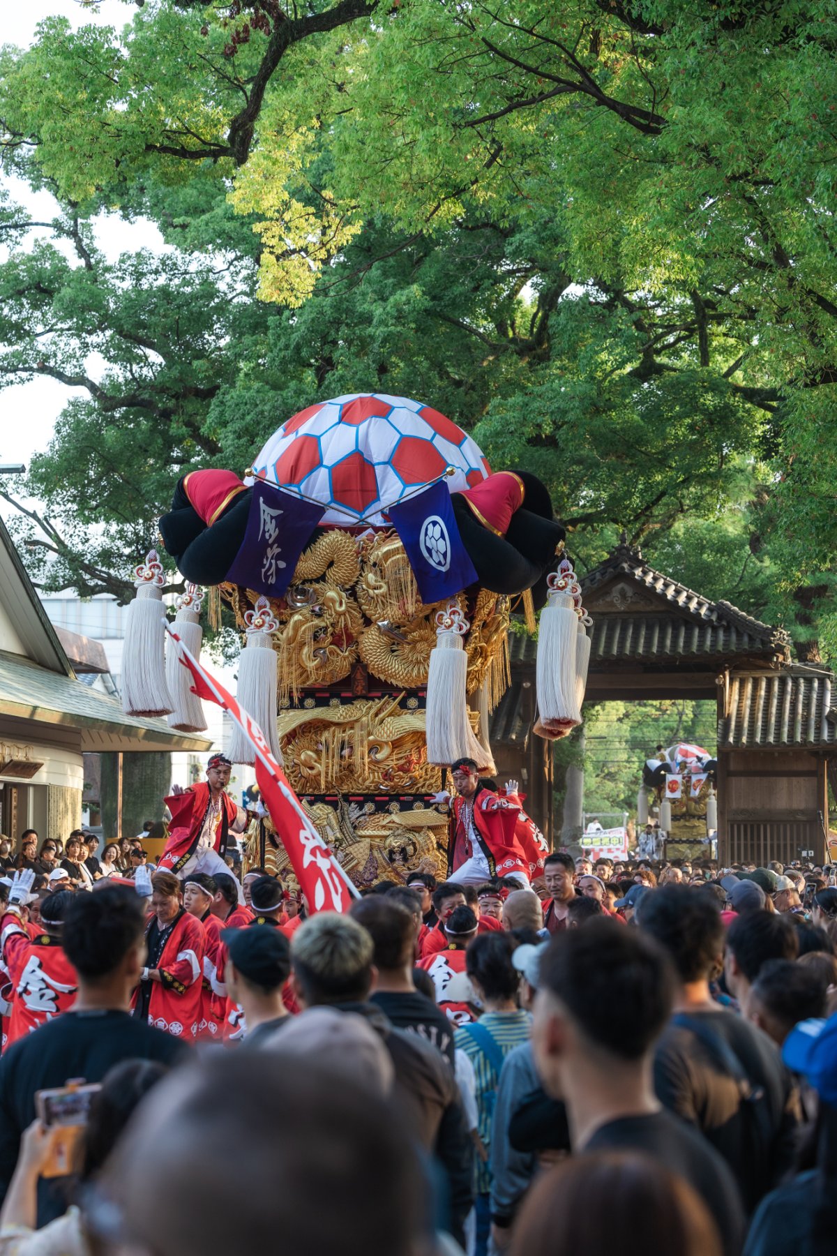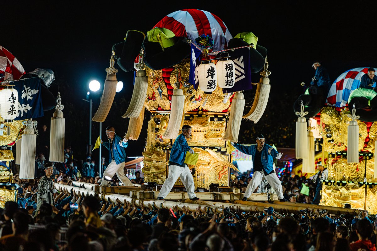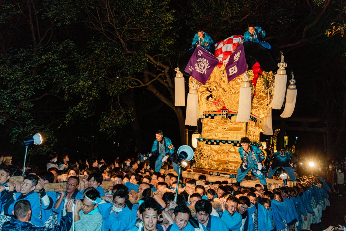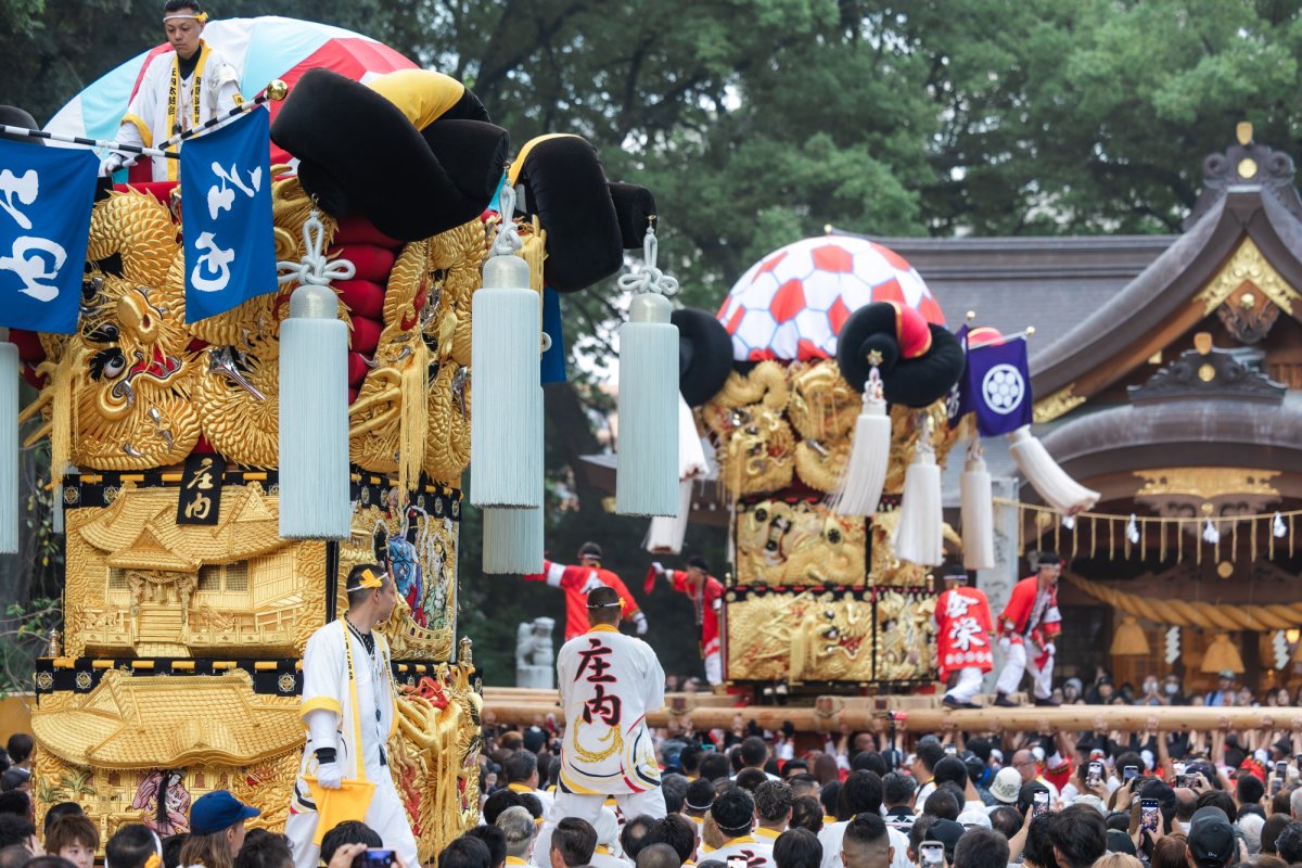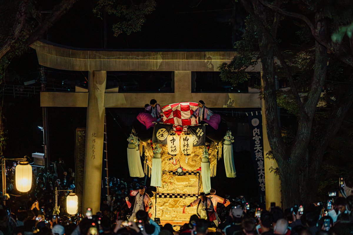 4つ目は「一宮神社」です。なんと言っても綺麗な楠群に囲まれた神社の長い参道を太鼓台が順番に通る様子がとても神聖なんです。参道から随神門を越えて境内に入ると各太鼓台の差し上げを楽しめます。一宮神社では桟敷席も用意されているため人混みが苦手という方でも観覧できます。