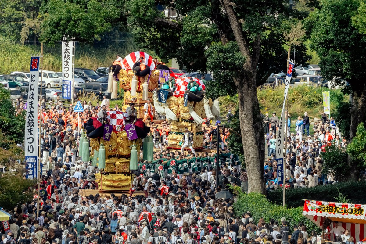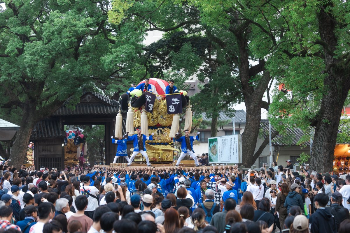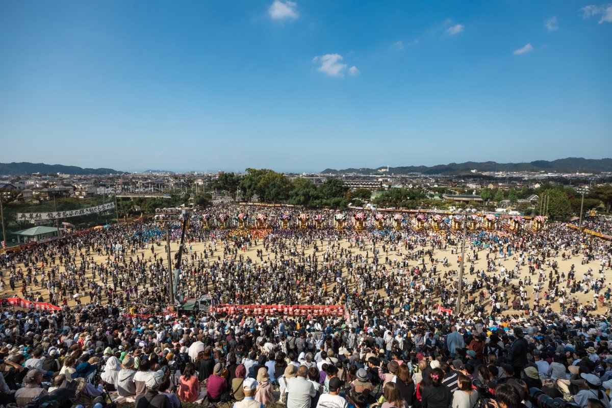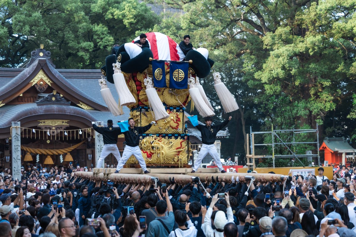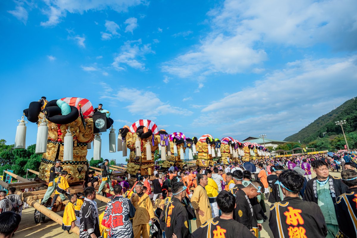 4つ目は「一宮神社」です。なんと言っても綺麗な楠群に囲まれた神社の長い参道を太鼓台が順番に通る様子がとても神聖なんです。参道から随神門を越えて境内に入ると各太鼓台の差し上げを楽しめます。一宮神社では桟敷席も用意されているため人混みが苦手という方でも観覧できます。
