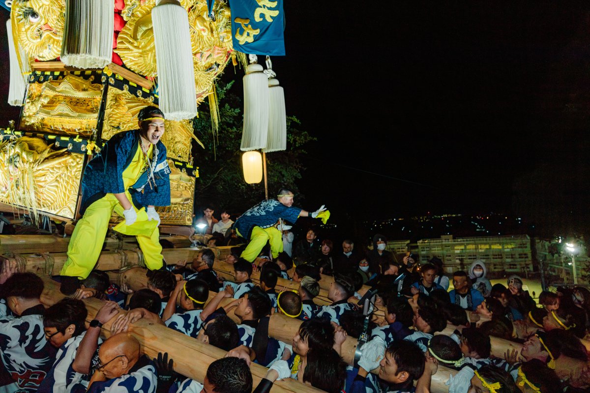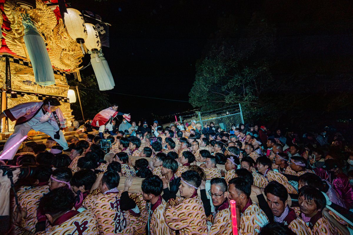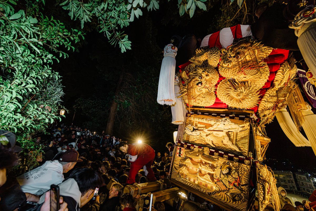 1つ目の「内宮神社の宮出し」をご紹介します。内宮神社の宮出しは10月16日の朝4時に角野地区の太鼓台が集結し、神社本殿までのおよそ100段ある石段を威勢のいい掛け声と共に登ります。この姿を一目見ようと、後ろからついていく人もかなり多いです。これを見ないと祭りが始まらないって方もいたため、ぜひ祭りの最初に訪れてみるのはいかがでしょうか。