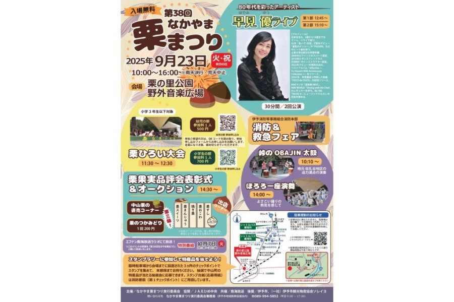 【2025】なかやま栗まつり 小学3年生までを対象にした「栗ひろい大会」が開催されるほか、「栗のつかみどり」や、ゆで栗・イガ栗のプレゼント、栗果実品評会等が行われる。大物スターによる野外ステージショーも開催予定。 エリア 松山市近郊(下灘駅、砥部焼など) カテゴリ まつり・花火・イルミネーション グルメ 開催期間 2025年9月23日 開催時間 10:00~16:00 開催場所 栗の里公園 住所 愛媛県伊予市中山町中山 電話番号 089-994-5852(伊予市観光物産協会ソレイヨ) アクセス JR伊予中山駅から徒歩で約20分 トイレ あり 駐車場 あり 公式WEBサイト 周辺情報を表示する 歴史 文化 自然 温泉 レジャー 体験 買物 道の駅 Google Mapの読み込みが1日の上限を超えた場合、正しく表示されない場合がございますので、ご了承ください。
