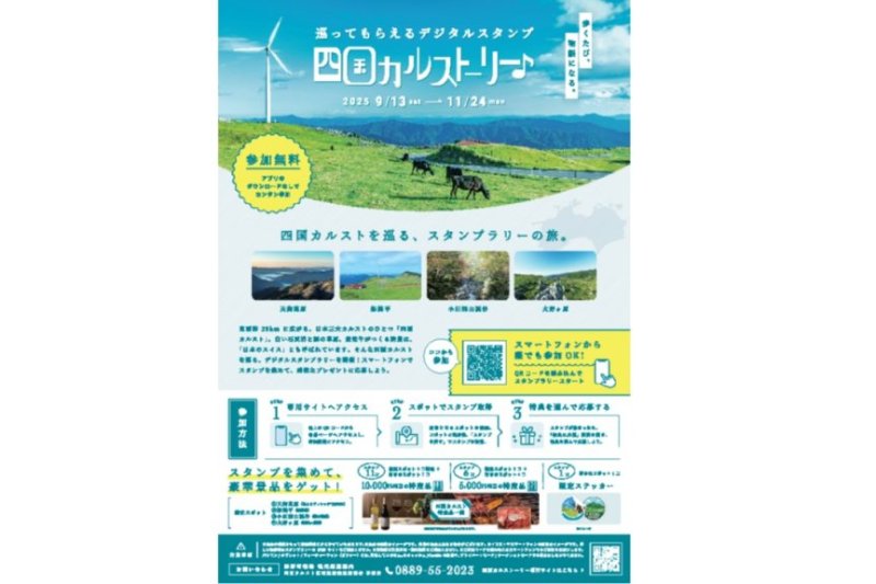 「日本のスイス」とも呼ばれ観光客の絶えない四国カルストエリアの主要な観光スポットを巡り、各市町の特産品が当たるキャンペーンを開催中です。
