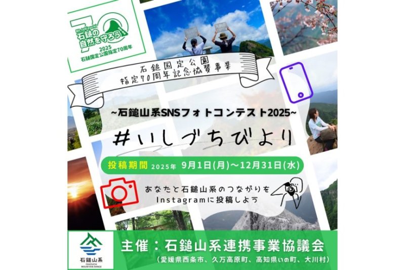 石鎚山系の多種多様な自然の特徴や魅力、また石鎚山系と地域のつながりをInstagramに投稿し、「石鎚山系の素晴らしさ」を全国に広げるフォトコンテストを実施中。作品受賞者には商品券といしづちグッズをプレゼント!