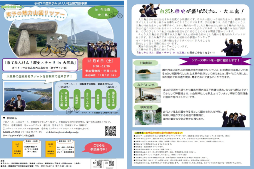 | お申し込み先電話番号 | 0897-47-3636(リージョナルデザイン株式会社) (1)氏名 (2)電話番号 (3)メールアドレス (4)住所 (5)生年月日 (6)希望ツアー(複数可) (7)スポーツバイクレンタル希望の有無 (8)身長(スポーツバイクをレンタル希望の方のみ)をご連絡ください。 【申込期限】12月3日(水) |