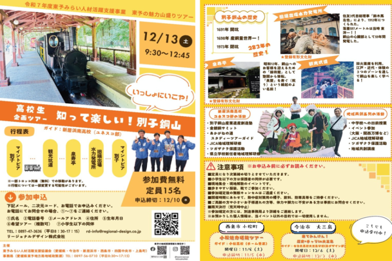 | お申し込み先電話番号 | 0897-47-3636(リージョナルデザイン株式会社) (1)氏名 (2)電話番号 (3)メールアドレス (4)住所 (5)生年月日 (6)希望ツアー(複数可) (7)小学生以下の同伴 をご連絡ください。 【申込期限】12月10日(水) |