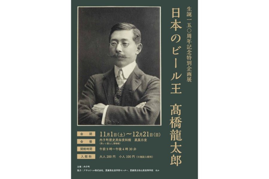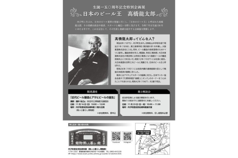 内子町に生まれ、日本のビール業界の発展に尽くし、「日本のビール王」と呼ばれた髙橋龍太郎。その功績は政治や経済、スポーツと幅広い分野に及びます。令和7年は生誕150周年にあたる年です。これを記念してその生涯と業績を紹介する特別企画展を開催します。
