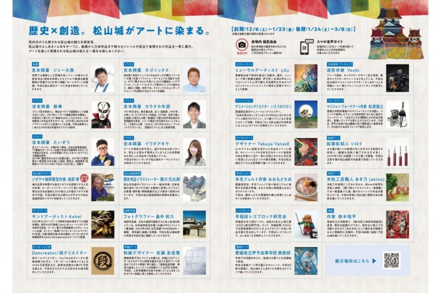 | イベント内容 | ○オープニングイベント 【日時】2025年12月6日(土)11:00~12:30 【場所】松山城本丸広場 ○作品展示 ジミー大西さんやネゴシックスさん、鉄拳さんなどアート芸人やアーティストの皆さんが松山城やよしあきくんをモチーフに作品を手掛けました。さまざまなジャンルや技法の全23作品を松山城などに展示します。 【展示場所】松山城、二之丸史跡庭園、長者ヶ平、ロープウェイ駅舎2階 ○重ね押しスタンプラリー 会場内の5カ所のスタンプスポットを巡り、専用台紙に全てのスタンプを重ね押しすると、カラフルなイラストが完成します。 【設置場所】松山城天守 入口付近、十間廊下、二之丸史跡庭園、長者ヶ平 ロープウェイ・リフト山頂駅、ロープウェイ駅舎2階 【台紙配布場所】松山城天守 入口付近、二之丸史跡庭園 ○インスタグラムキャンペーン 展示されている作品またはオープニングイベント写真を、インスタグラムで「#(ハッシュタグ)松山城おもしろ芸術祭」をつけて投稿すると、抽選で50名にネゴシックスさんデザインのクリアファイルをプレゼントします。 |