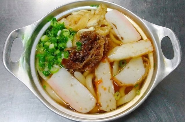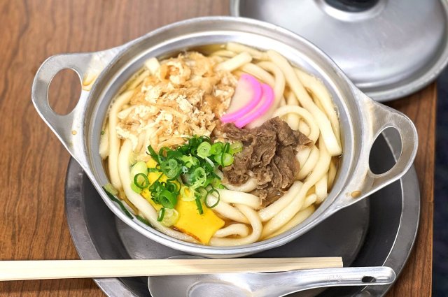 親子3代にわたって愛される松山のソウルフード。甘いものが貴重だった時代、砂糖の代わりなるようにと甘く味付けたのが始まりなのだそう。柔らかい食感のうどんに甘く煮付けた牛肉と油揚げを盛りつけた、どこか懐かしく、ほっとする味わいが魅力です。