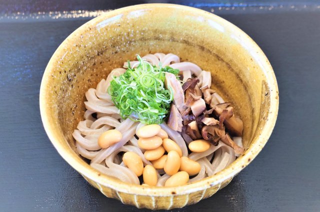 もち麦とは、はだか麦のうちの「もち性」の品種で、食物繊維の含有率が高く、血中コレステロールを下げる働きもあるというスーパーフードのことをいいます。もち麦で作ったうどんは、のど越しよく風味豊かな味わい。内子産のシイタケでとっただし、トッピングに大豆をのせるなど、ヘルシー尽くしの一杯です。