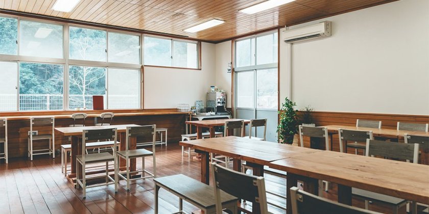 木のぬくもりが醸し出す居心地の良さも大きな魅力です。大きな窓からは久万高原の美しい山々が望め、耳を澄ませば川のせせらぎも聞こえてきそうです。まさに廃校・グルメ・自然の三拍子がそろった特別な体験です。駐車場も完備していますので、気軽に訪れてステキな思い出をつくってみてはいかがでしょうか。