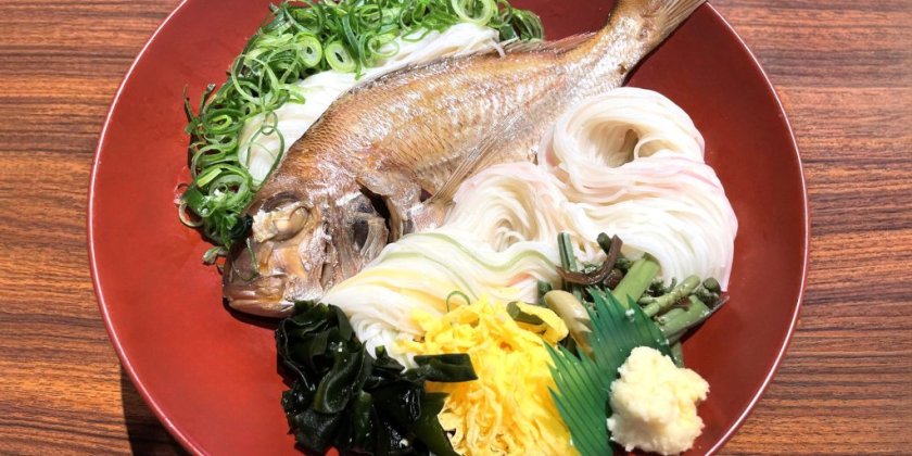 鯛を一匹まるごと姿煮にしたものと、茹でたそうめんを大皿に盛りつけた「鯛そうめん」。鯛の煮汁をそうめんのつけ汁や、かけ汁として使用。鯛は縁起物として知られているため、家族や親族でのお祝い時の郷土料理として振舞われます。松山市では名物の「五色そうめん」が使われ、目でも舌でも味わえる彩りが豊かな一品となります。