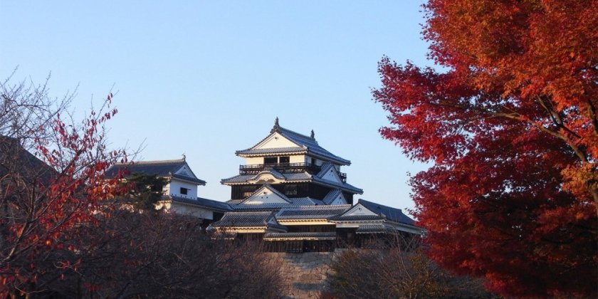 山頂の本丸広場では、天守を背景に色づく木々を楽しめます。天守閣に登って、市街地を一望しつつ、本丸広場の紅葉を望んでみましょう。
