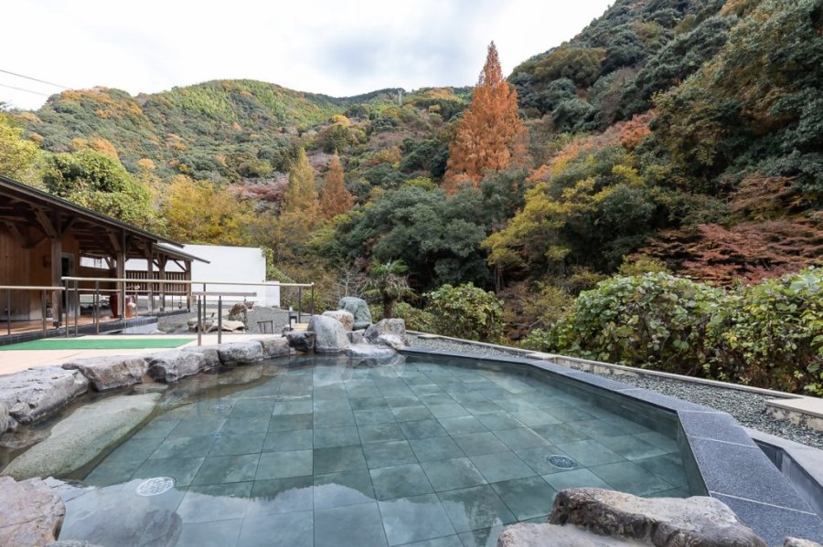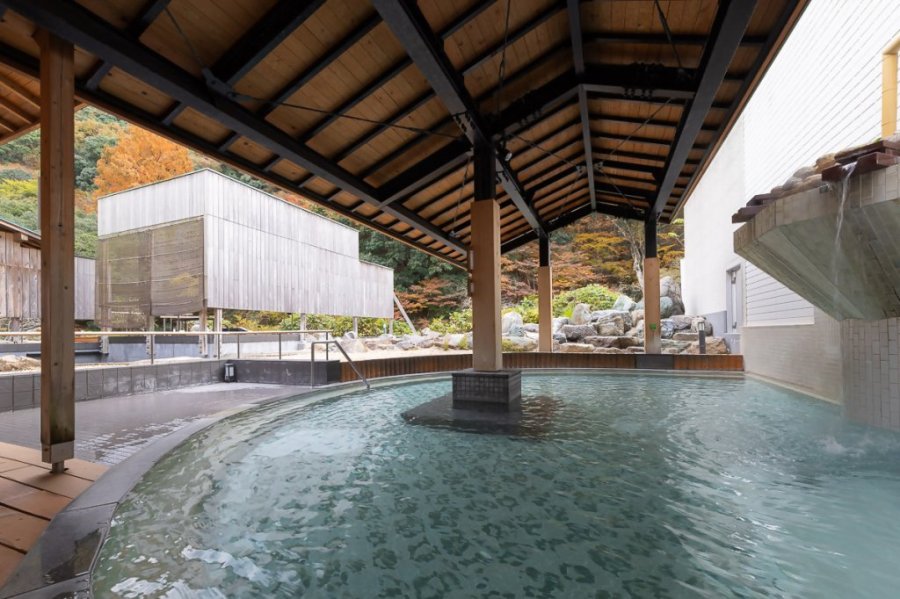 石手川の上流に位置し、西日本最大級の露天風呂がある温泉施設。趣の異なる7種の湯船が整備された大露天風呂では、源泉かけ流しの美人の湯と四季折々の渓谷美を同時に堪能することができ、身も心もリラックス。