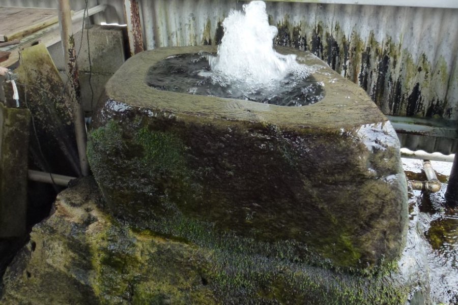 海底にある水源から清水を汲み上げている弘法大師の伝説が残る湧水。弘法大師が四国霊場を巡礼している途中で休息していたところ、老婆が飲み水を水桶に入れて歩いており、弘法大師は一杯の水をもらい喉の渇きを潤した。後、この水は遥か遠くから汲み取ってきたということを知った弘法大師が、杖の先で大地を2、3回突くと清水が湧き出したという伝説が残っている。毎日多くの人が水を汲んだり、手を清める場として利用しており、弘法水の付近にある民家には長寿の人が多いと言われている。
