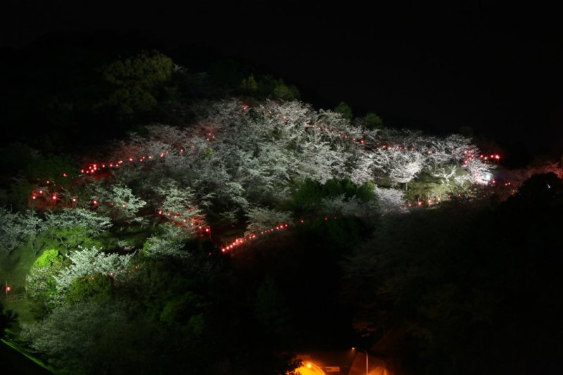 毎年、3月下旬~4月初旬に桜祭りが開催され、数百個のボンボリに灯された夜桜は必見である。